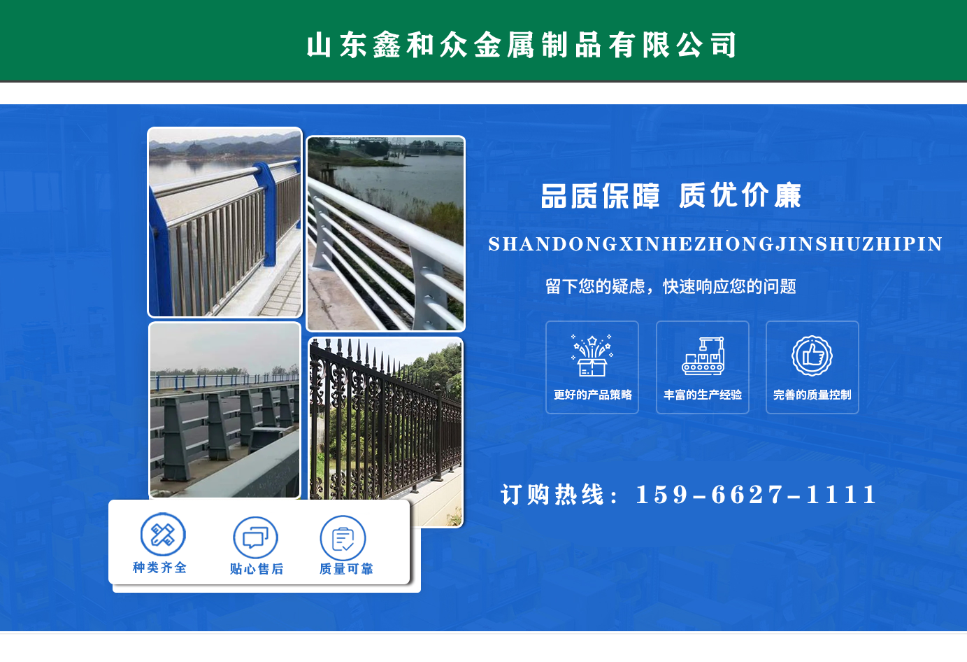 山東鑫和眾金屬制品有限公司主要產(chǎn)品有防撞護(hù)欄,橋梁護(hù)欄,道路護(hù)欄,河道護(hù)欄,不銹鋼護(hù)欄等護(hù)欄。提供設(shè)計(jì)方案,一站式定制,包您滿意價(jià)格優(yōu)惠,歡迎來(lái)電咨詢(xún)! 公司常年從事銷(xiāo)售護(hù)欄防撞護(hù)欄,橋梁護(hù)欄,道路護(hù)欄,河道護(hù)欄,不銹鋼護(hù)欄,橋梁鋼護(hù)欄,河道燈光護(hù)欄等。產(chǎn)品廣泛應(yīng)用于橋梁、河道、旅游景區(qū)、道路、公路、公園、小區(qū)、景觀、道路防撞等領(lǐng)域?! 」井a(chǎn)品均采用優(yōu)質(zhì)不銹鋼材料,符合相關(guān)標(biāo)準(zhǔn)。各種型號(hào)不銹鋼復(fù)合管及護(hù)欄,質(zhì)量嚴(yán)格把控。產(chǎn)品強(qiáng)度高、耐腐蝕、焊接牢固、抗沖擊、性能好,防撞護(hù)欄結(jié)構(gòu)簡(jiǎn)單、美觀實(shí)用大方?! g迎前來(lái)訂購(gòu)!...
